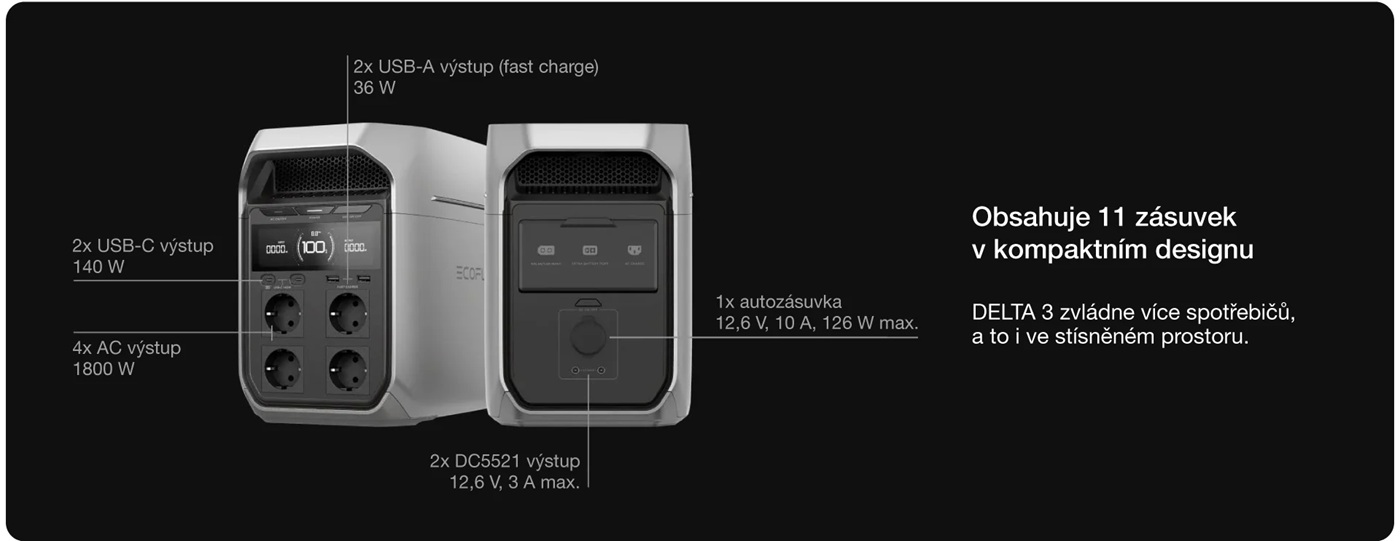 V porovnání s DELTA 3 nabízí DELTA 3 Plus vyšší napájecí výkon prostřednictvím USB-A a USB-C portů a celkem 2 porty pro solární nabíjení s celkovým maximálním výkonem 1 000 W.