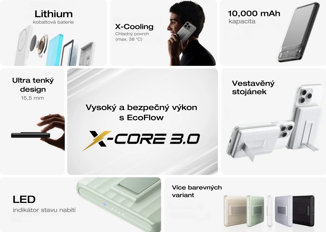 Základem této powerbanky je lithium kobaltová baterie a díky originální technologii EcoFlow X-Cooling sleduje teplotu připojeného telefonu a drží jej pod 38°C, čímž prodlužte životnost baterie. Powerbanka má čtyři LED diody sledují stav baterie v reálném čase.
