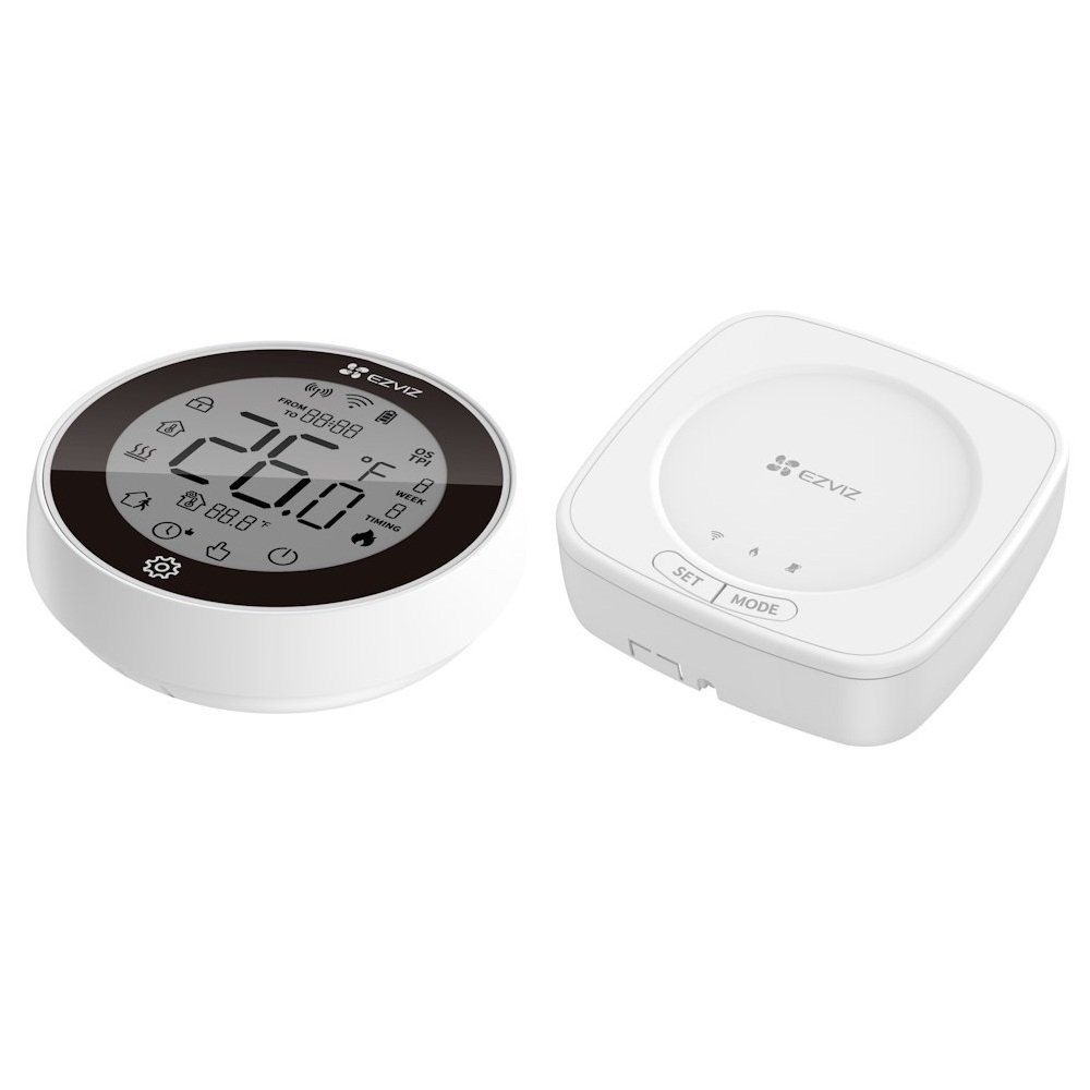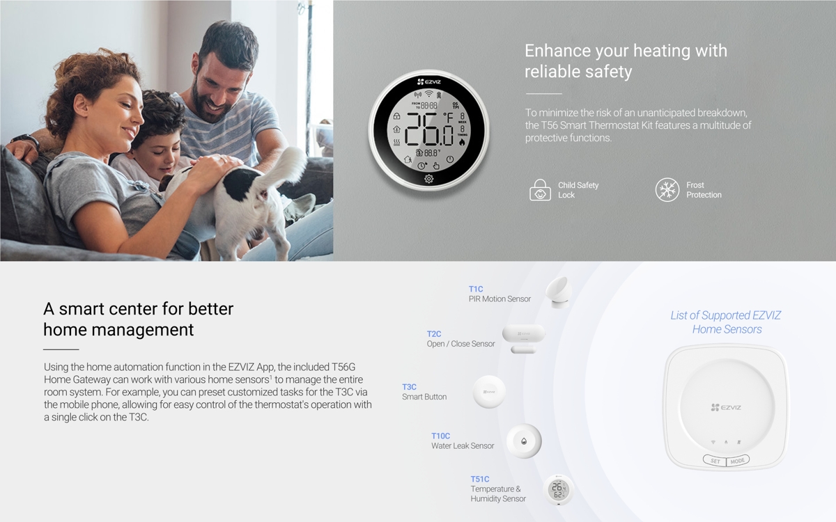 Sada T56 Smart Thermostat Kit kombinuje termostat T56T s domácí bránou T56G pro přesné řízení teploty kotle a zajištění komfortního vnitřního klimatu. Systém je navržen pro snadnou instalaci a intuitivní ovládání s možností vzdáleného řízení přes mobilní aplikaci EZVIZ.