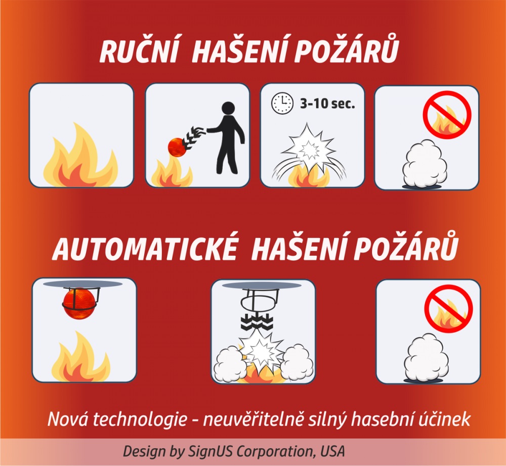 Při vzniku požáru a zahřátí ohněm dojde i v místnostech bez dozoru osob k mžikovému rozptylu a automaticky pokryje vrstvou hasicího prášku s vysokou účinností a uhasí požár stejně jako při vhození do ohniska požáru.