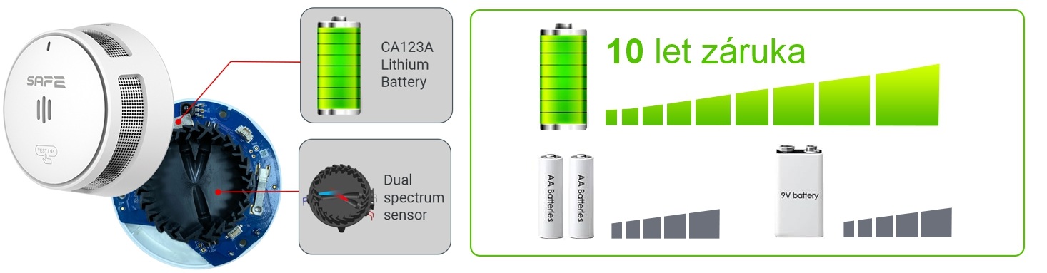 Nová generace detektoru požáru k nepřetržitému monitorování ovzduší na přítomnost kouře s přelomovou detekcí dvouspektrální prachu odolné optické komory napájeného integrovanou lithiovou baterií (zabudovanou, neměnitelnou) garantující mimořádně dlouhý provoz zařízení po více jak 10 let a prodlouženou 10letou zárukou.