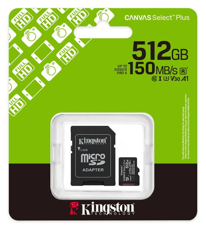 Kingston MicroSDXC paměťová karta 512GB Canvas Select Plus A1 Gen 3 + SD adaptér