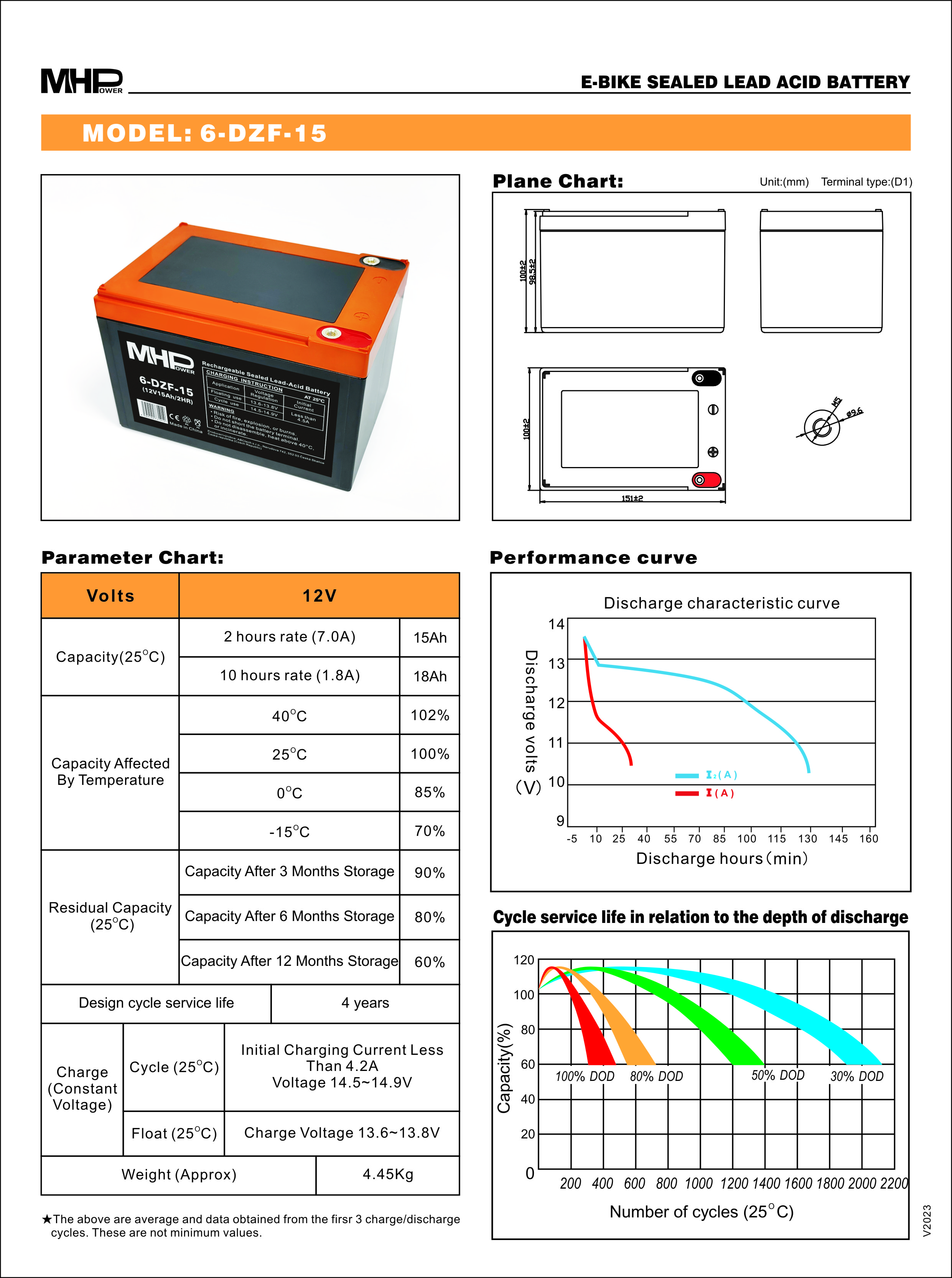 MHPower 6-DZF-15 Trakční gelová baterie 12V/15Ah, Terminál D1 - M5, Deep Cycle