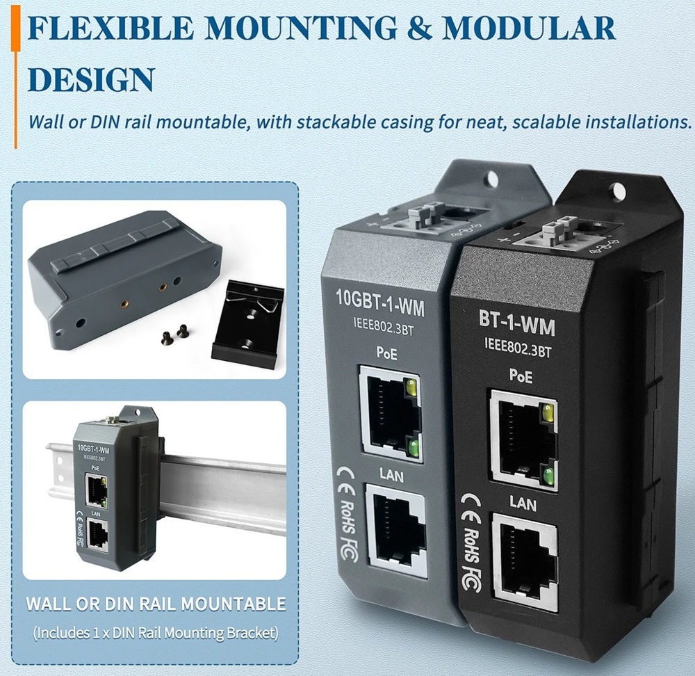 Díky důmyslné konstrukci lze injektory spojovat do kompaktních celků a montovat je nejen na zeď, ale také na DIN lištu. Držák na DIN lištu je součástí balení.