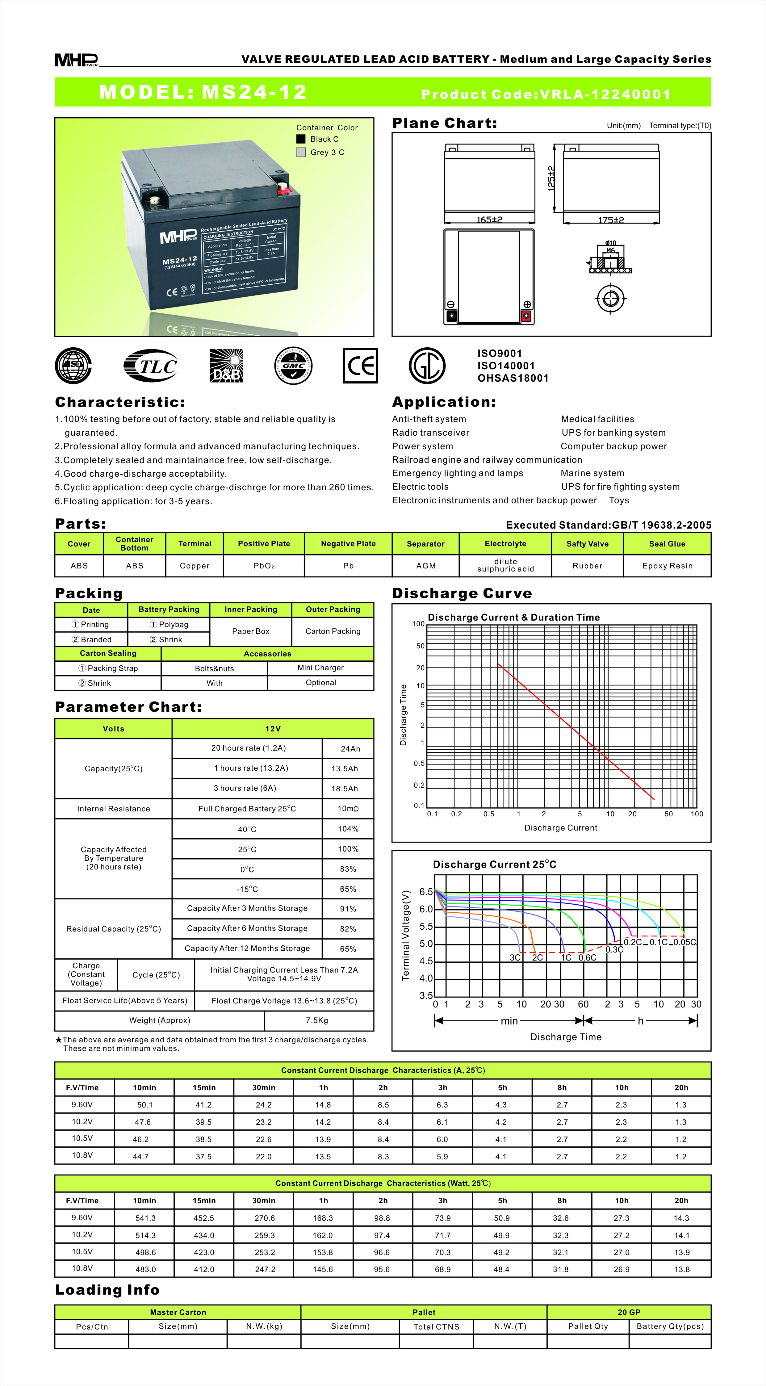 MHPower MS24-12 olověný akumulátor AGM 12V/24Ah, Terminál T1 - M6