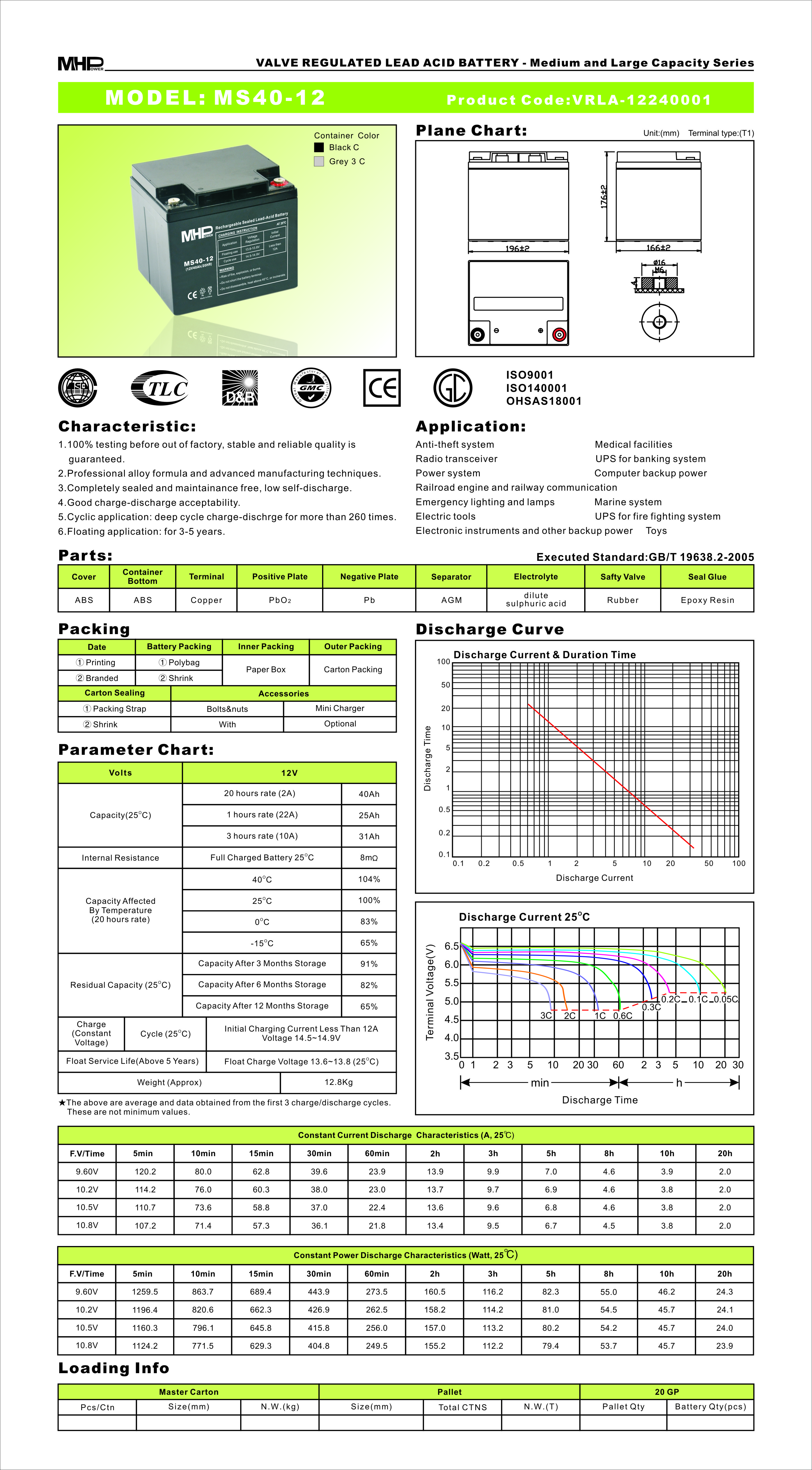 MHPower MS40-12 olověný akumulátor AGM 12V/40Ah, Terminál T1 - M6