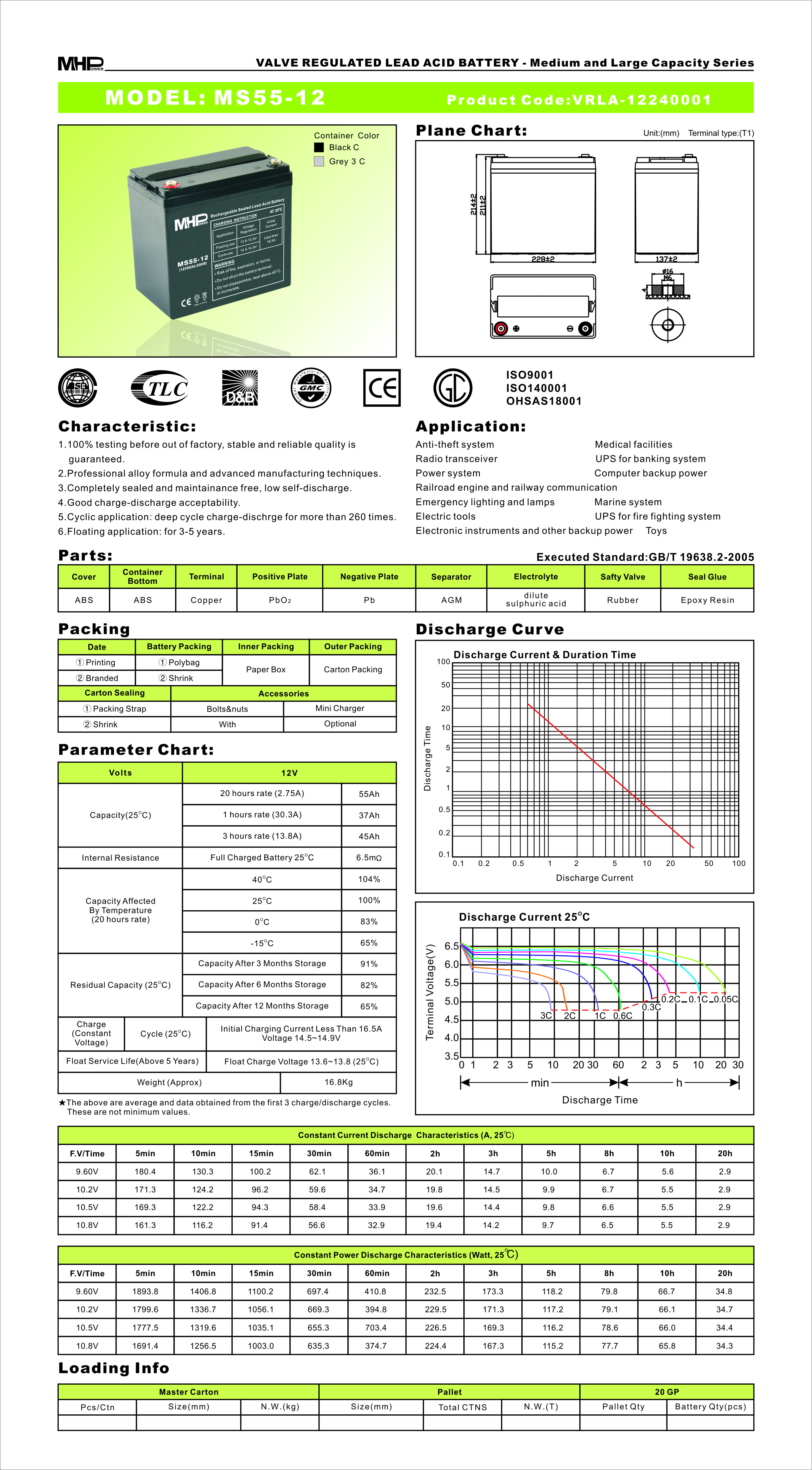 MHPower MS55-12 olověný akumulátor AGM 12V/55Ah, Terminál T1 - M6