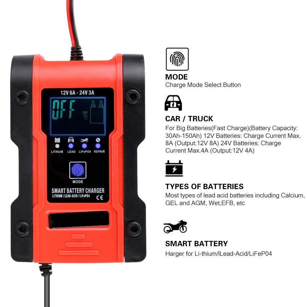 7-stupňové nabíječky jsou vhodné pro většinu typů baterií včetně vápenatých, gelových AGM, LiFePo4, mokrých, olověných baterií. Mohou také pomoci obnovit vybité a sulfátované baterie.