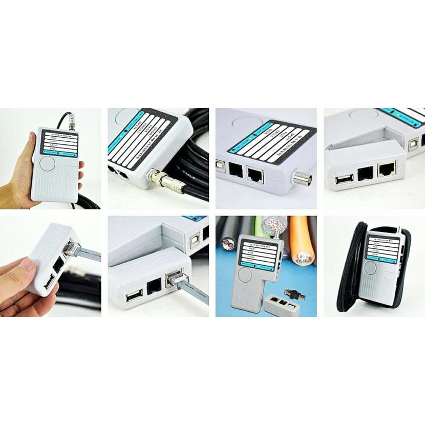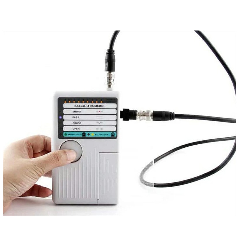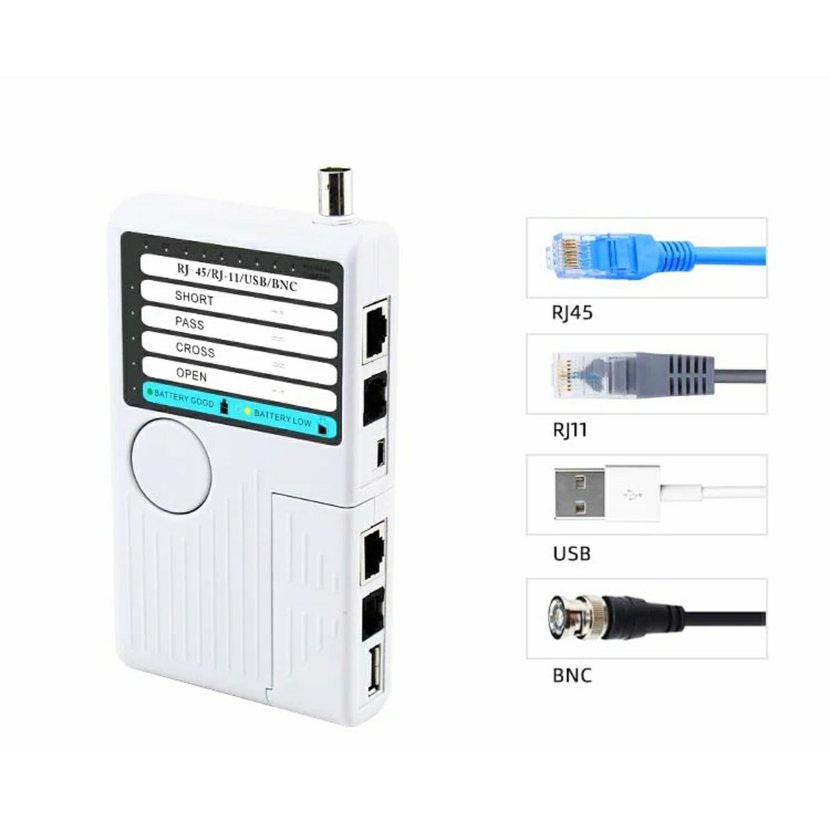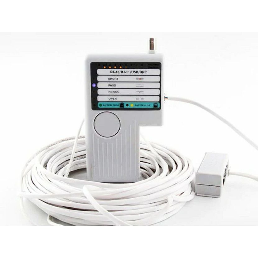 Tester pro síťové kabely zakončené konektory RJ-11,12,45 nebo koaxiální kabely a USB. Dokáže zjistit, zda kabel není přerušený, jestli nemá zkratované některé žíly nebo zjistit typ kabelu - patch nebo cross. Lze testovat kabely jak volné přímo testerem, tVíce