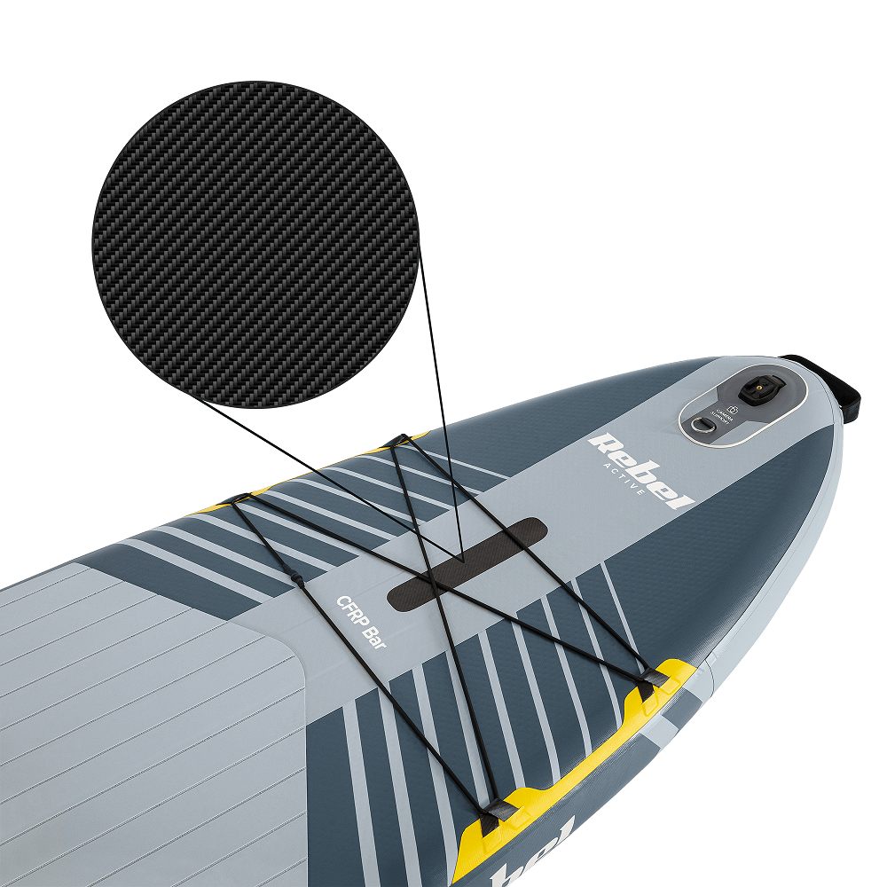 Rebel Active Pro RBA-4518 posouvá hranice běžných nafukovacích boardů díky chytrému použití materiálů. Jádro tvoří osvědčená technologie Drop-stitch, která zajišťuje, že deska po nafouknutí drží tvar. Co však skutečně oceníte, je 3mm vrstva EVA pěny na palubě, která je nejen protiskluzová, ale i příjemná na dotek. Klíčovým prvkem je pak karbonová výztuha, která dodává konstrukci extra tuhost v kritické zóně stání. Výsledkem je pocit z jízdy, který se blíží pevným kompozitním deskám.
