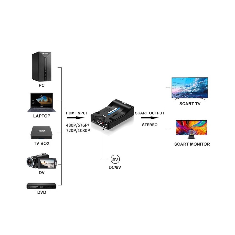Umožní připojit HDMI signál do staršího TV s konektorem SCART.