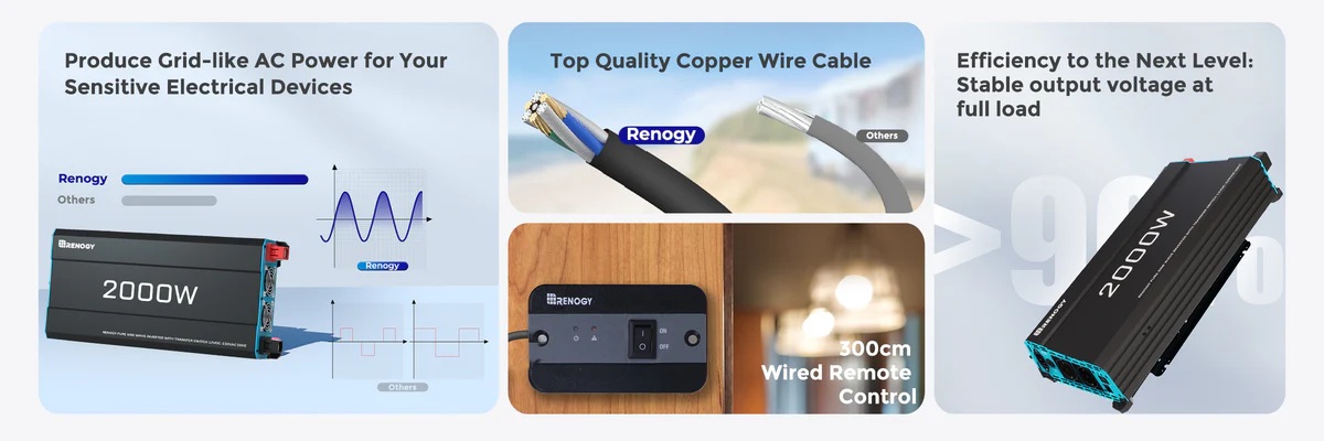 Měnič Renogy poskytuje kontinuální výkon 2000W s možností krátkodobého zatížení až 4000W, což umožňuje napájet i náročnější spotřebiče v karavanu. Pracuje na principu přeměny 12V stejnosměrného proudu z baterie na 230V střídavý proud s frekvencí 50Hz. VýsVíce