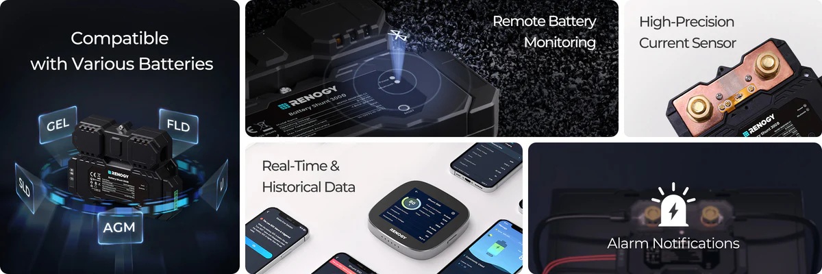 Renogy Smart Shunt 300 je kompatibilní se všemi vašimi startovacími bateriemi a hlavními bateriemi, včetně olověných (AGM, GEL), lithium-železitých, lithium-iontových a nikl-metalových hybridních.