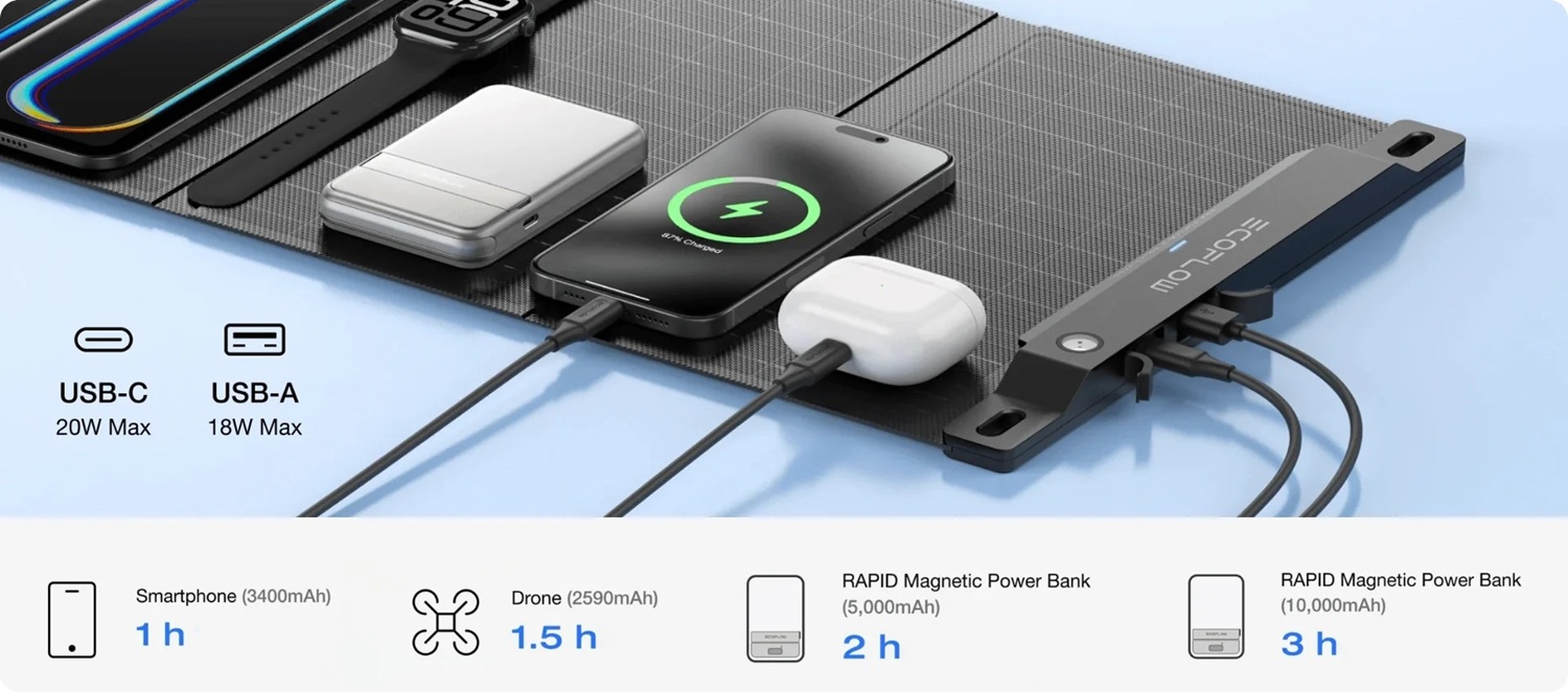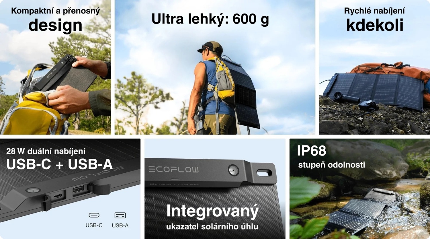 Základem 28W přenosného solárního panelu EcoFlow (typ-C) jsou pokročilé monokrystalické křemíkové solární články TOPcon s účinností 25 %. Panel je velmi skladný, vyniká velkou odolností a nízkými nároky na údržbu. Snadno se upevní i na batoh a disponuje výstupy USB-A a USB-C. I během túry tak může průběžně dobíjet mobil, fotoaparát nebo powerbanku.