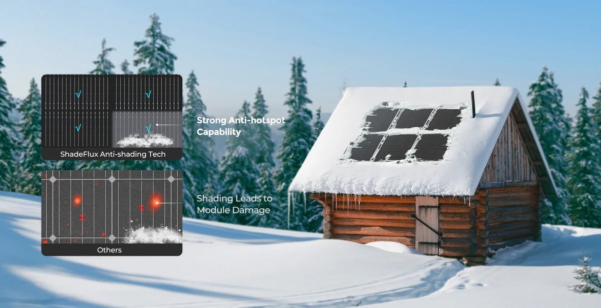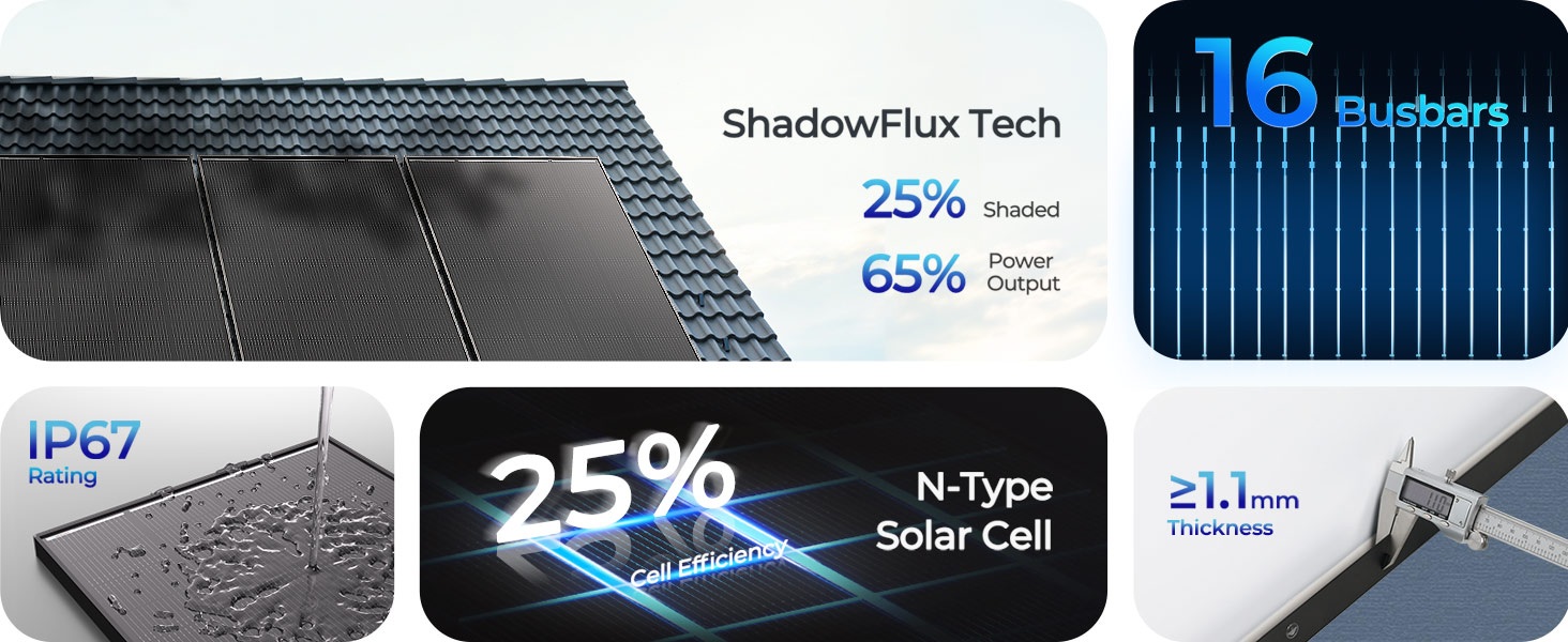 - Technologie Shadowflux: Využívá technologii, která minimalizuje ztráty výkonu při částečném stínění. Díky tomu si můžete být jisti, že váš solární panel bude efektivní i při částečném zakrytí, například při zaparkování vozu pod stromy