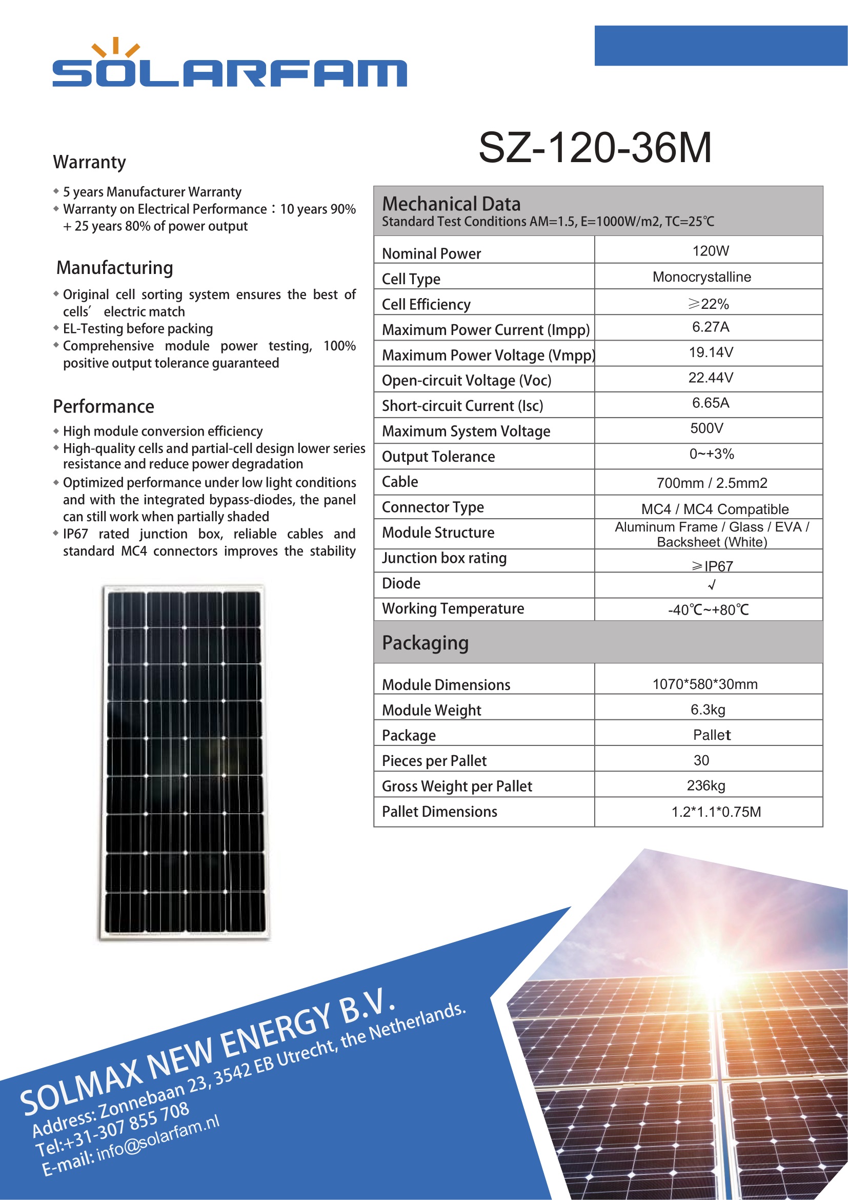 Solární panel SOLARFAM 120W mono, 1070x580x30mm, černý rám