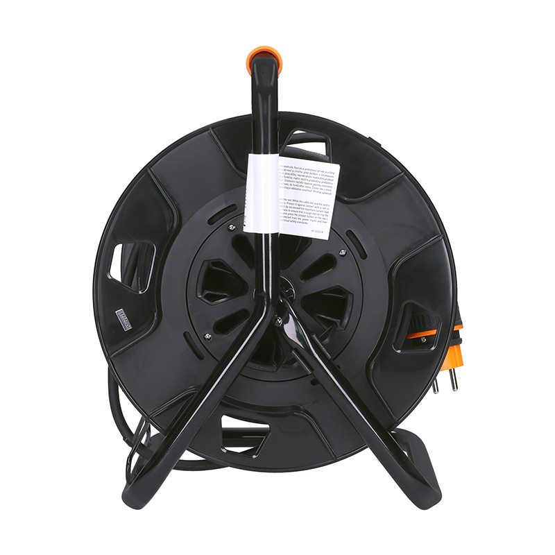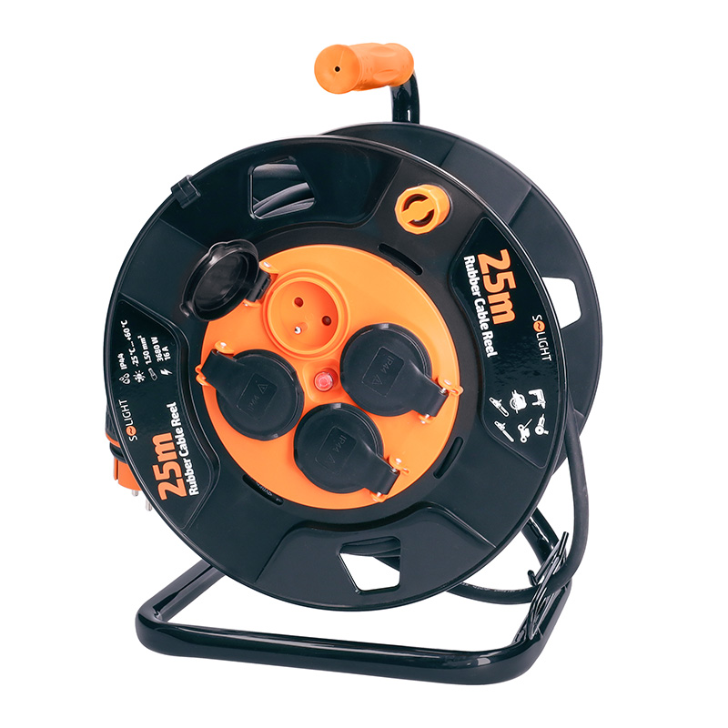 Gumový kabel typ H05RR-F 3G s vodiči o průřezu 3×1,5 mm2 je vhodný pro venkovní použití i vnitřní prostory. Buben je vybaven zásuvkami s dětskými pojistkami a tepelnou pojistkou, která zajišťuje bezpečnost při přetížení nebo neúplném odvinutí kabelu. Produkt splňuje stupeň krytí IP44, který zajišťuje ochranu proti stříkající vodě. Vhodný pro bezpečné a spolehlivé připojení stavebních, zahradních i méně náročných průmyslových zařízení.