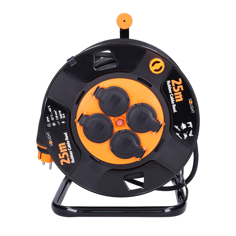 25m gumový kabel na bubnu z odolného plastu a čtyřmi zásuvkami je ideální pro použití venku, na zahradách, stavbách nebo v dílnách. Bytelná konstrukce s krytými zásuvkami i kabel samotný jsou odolné proti povětrnostním podmínkám a mechanickému namáhání.