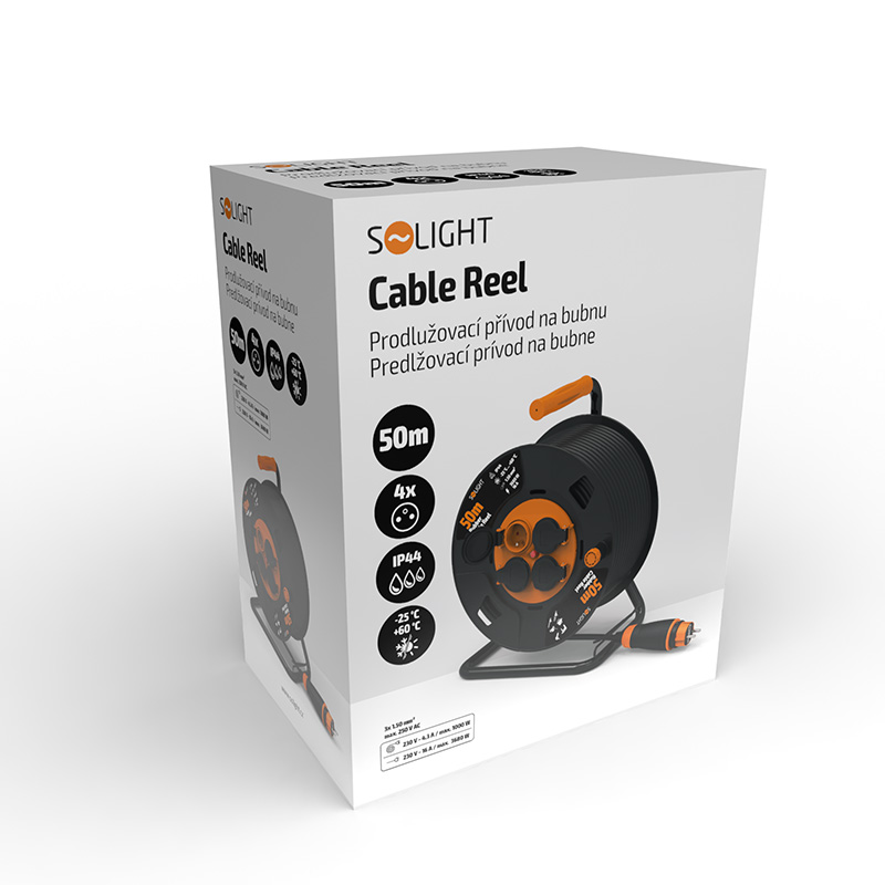 Solight PB34 prodlužovací přívod na bubnu, 4 zásuvky, venkovní, 50m gumový kabel, 3x 1,5mm2, IP44
