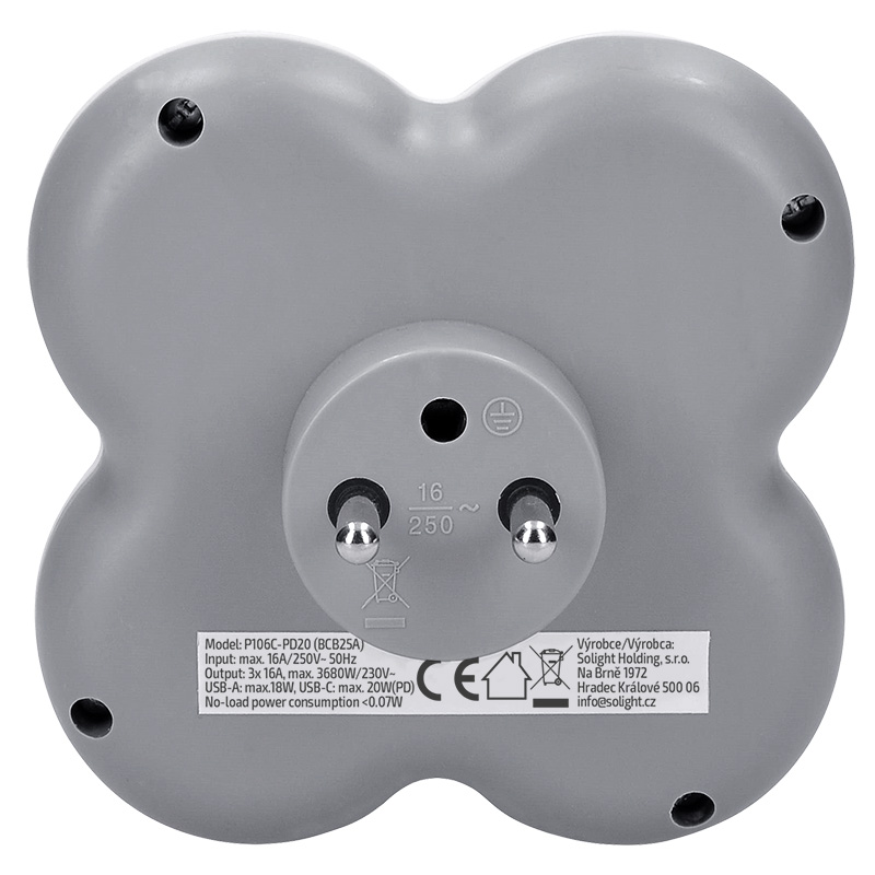 Solight rozbočka, 3x 16A, USB A+C rychlonabíječka 20W PD, bílá-šedá