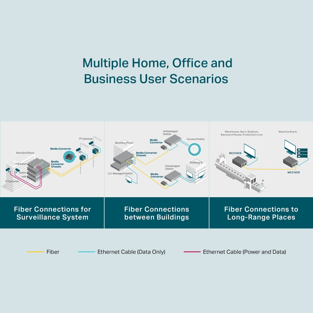 Mezi další funkce tohoto modulu patří možnost použití jako samostatného zařízení (nevyžaduje žádné šasi) nebo se šasi TP-LINK 19', automatická detekce MDI/MDI-X pro port TX a stavové LED kontrolky na čelním panelu. Modul MC210CS podporuje přenos dat pomocí jednorežimového optického kabelu na vzdálenost až 20 km.