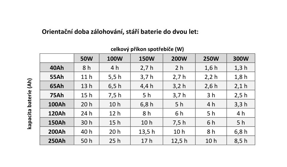 Příklady použití a doby zálohování, stáří baterie do dvou let. :