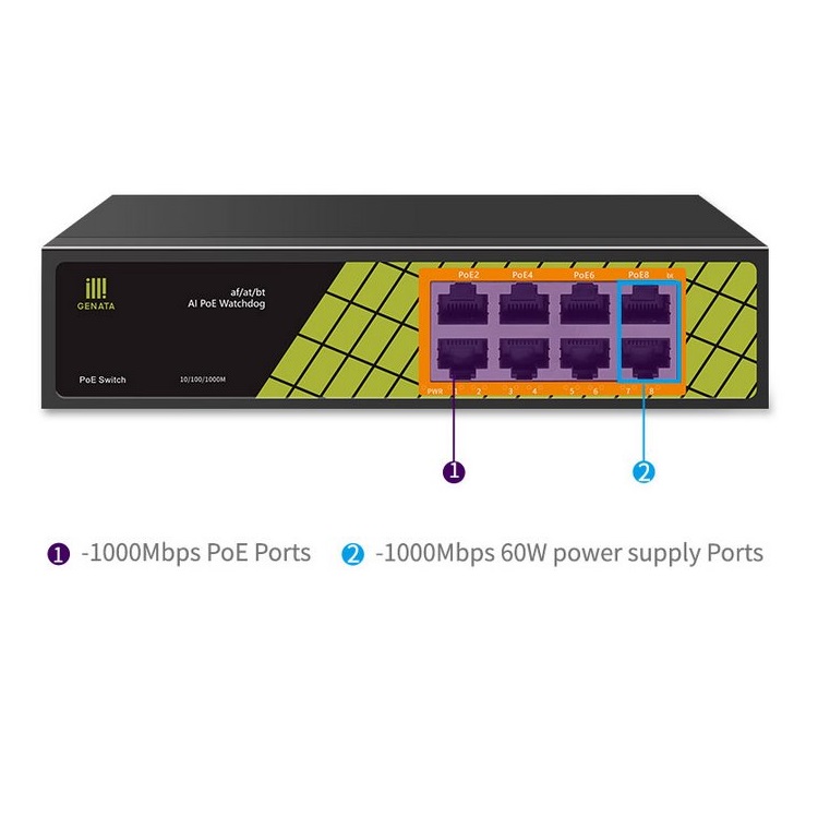 - (6) 802.3af/at PoE (30W/port) + (2) 802.3af/at/bt PoE (60W/port)