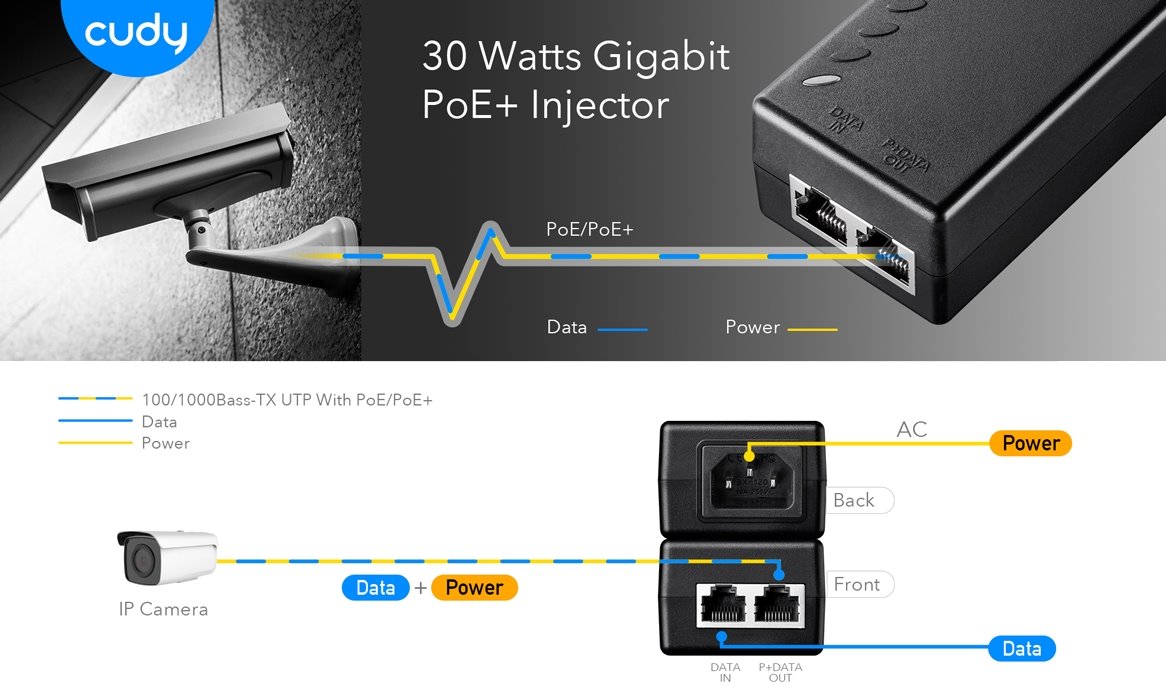 Výkonný PoE injektor značky Cudy umožňuje přenos napájení i dat do vzdálenosti 100 metrů s podporou rychlostí 10M/100M/1G. Díky standardům 802.3af/at poskytuje 30 W výkonu a je tak ideální pro napájení zařízení, jako jsou IP kamery, přístupové body, VoIP Více