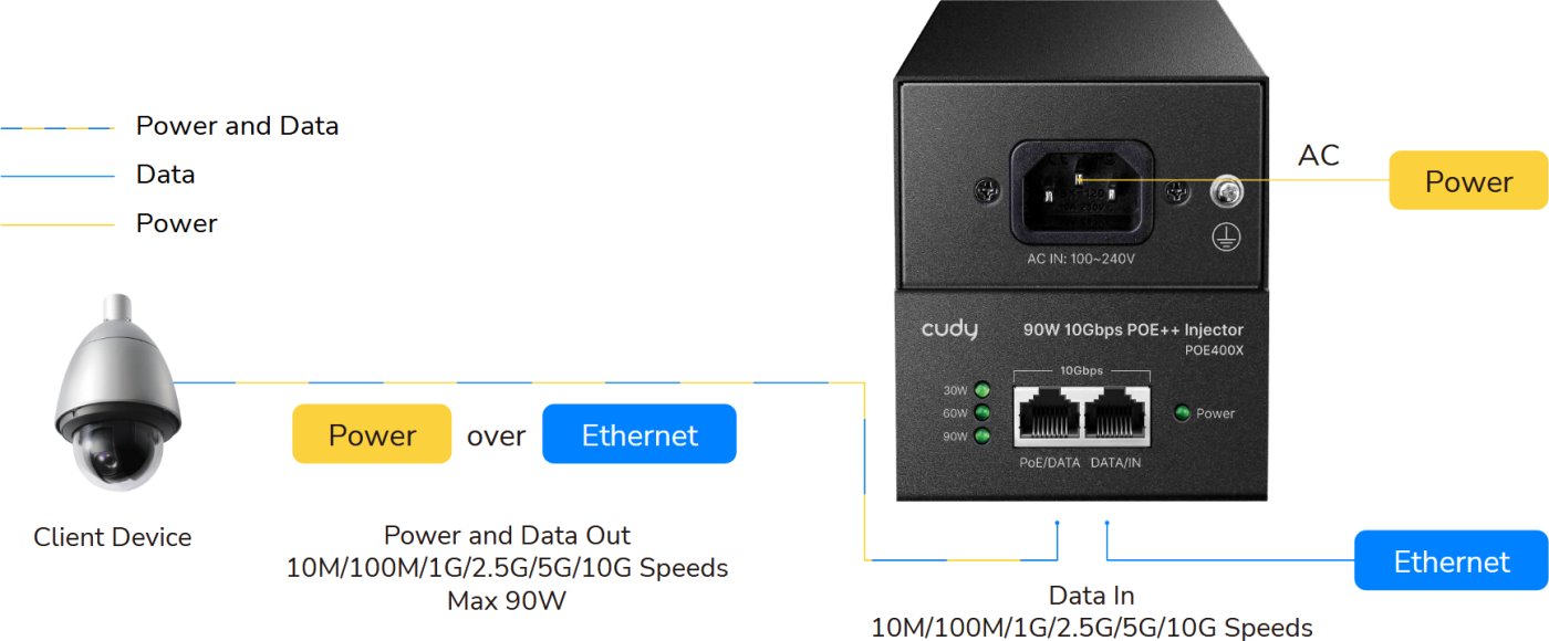Výkonný PoE injektor značky Cudy umožňuje přenos napájení i dat až do vzdálenosti 90 metrů s podporou rychlostí 10M/100M/1G/2.5G/5G/10G. Díky standardům 802.3af/at/bt poskytuje až 90 W výkonu přes čtyři páry vodičů a je tak ideální pro napájení náročnějšíVíce