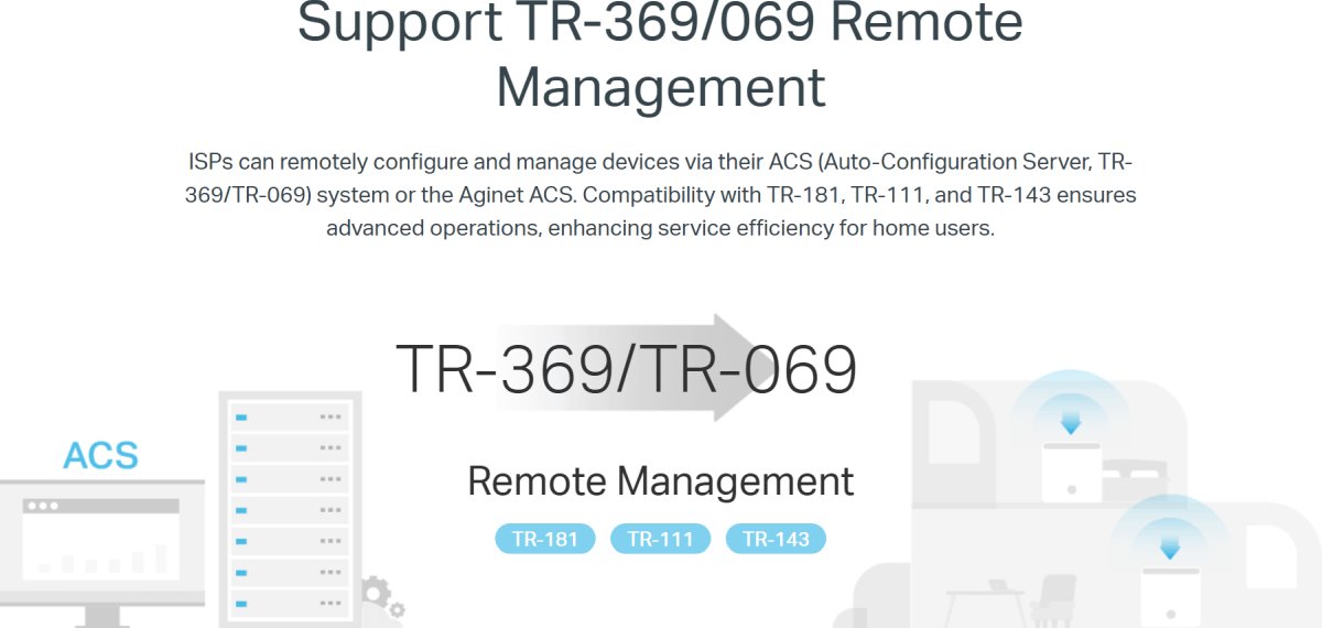 - Podpora vzdálené správy: podporována cloudová správa TAUC, TR-098, TR-181, TR-111 a TR-143.