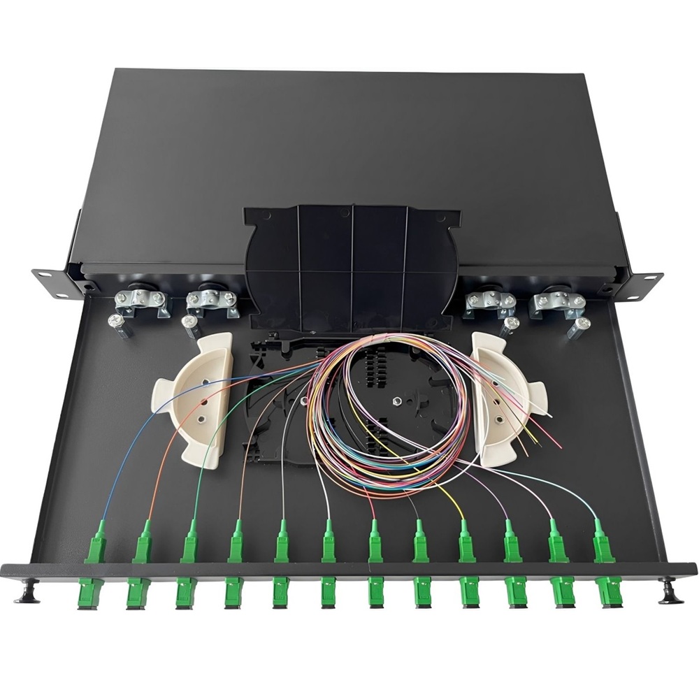 Optická vana s 12x SC/APC simplex spojkami a optickou kazetou je navržena pro montáž do 19" racku s výškou 1U. Vana je vybavena barevnými pigtaily a umožňuje snadný výsun, což zjednodušuje správu či údržbu optických kabelů uvnitř. Díky černému provedení zVíce