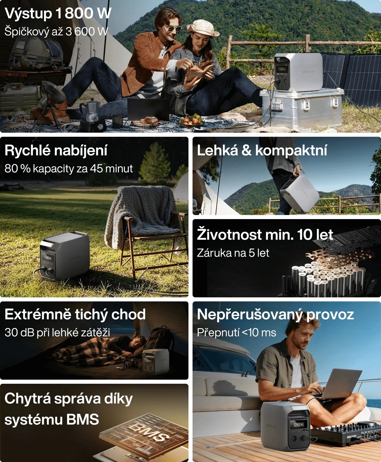 Moderní konstrukce vnitřní baterie stanice s menším množstvím článků, a tedy s chladnějším provozem a delší životností, poskytuje uživatelům větší stabilitu. Každý článek je navíc důkladně testován a celý komplet je optimálně vyladěný, aby velmi dobře chránil před přebíjením, nevyvážeností a předčasným opotřebením. Baterie obsahuje LFP články se strukturou CTC automobilové kvality, které poskytují až 10 let spolehlivého napájení a nepřetržitou BMS ochranu. Stanice je rovněž dobře chráněna před nárazy, což je důležité zejména při použití v terénu.