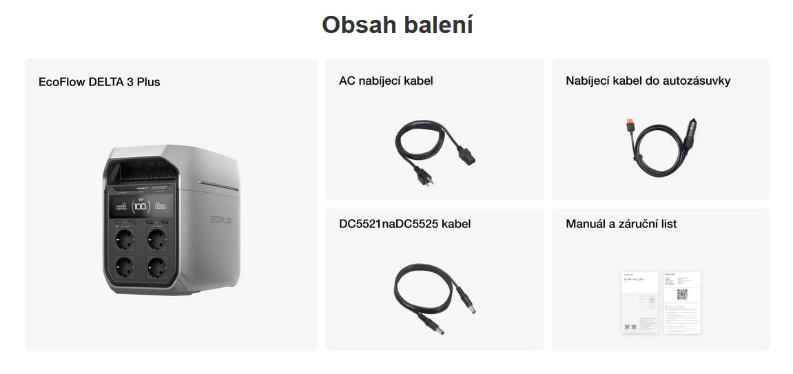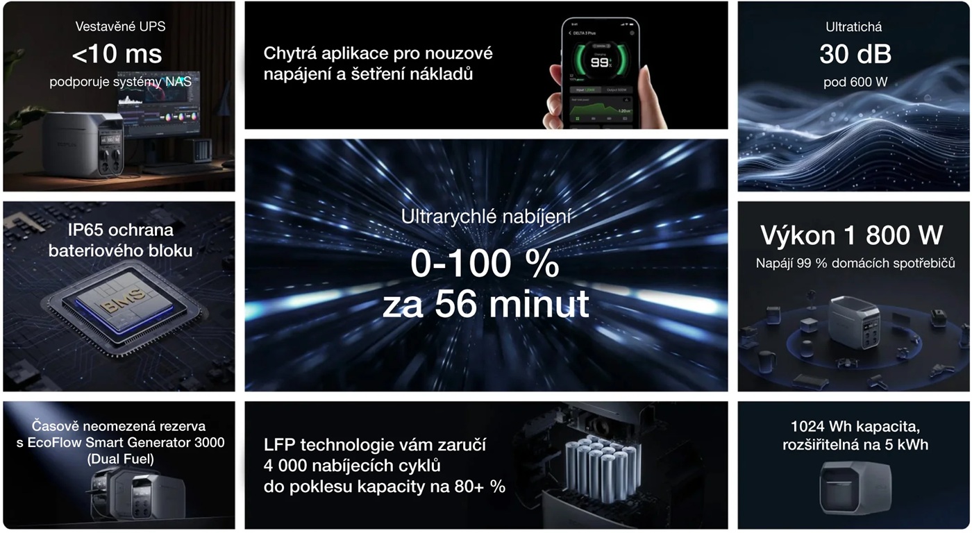 EcoFlow DELTA 3 Plus je bateriová stanice s akumulátorem LiFePO4 a kapacitou 1024 Wh. Má několik výstupů, včetně standardních zásuvek střídavého proudu, portů USB-A, portů USB-C, 12V DC portů a portu pro přídavnou baterii, kterými lze napájet celou řadu sVíce