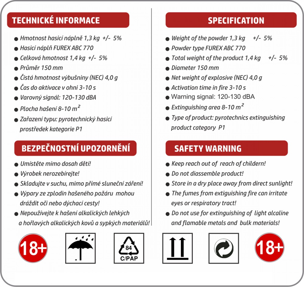 Protipožární hasicí koule je dodávána ve vakuovaném obalu, který obsahuje hasicí kouli s práškovou směsí FUREX 770 a iniciátorem. Při kontaktu s ohněm se aktivuje, vydá varovný signál a uhasí požár na ploše 8–10 m2, obvykle do 3 vteřin. Rozptyl prášku je bezpečný.