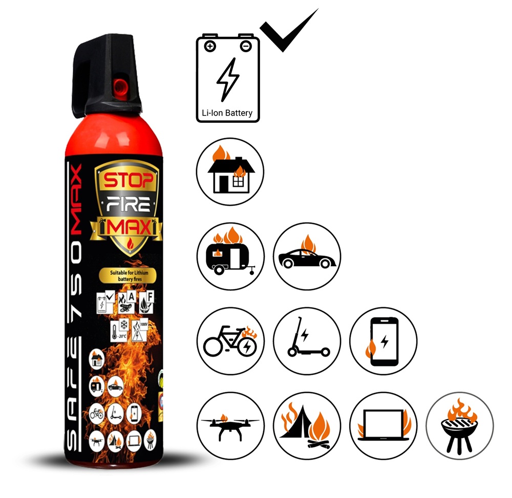 SAFE 750 MAX však nabízí mnohem více. Je jedním z mála hasicích prostředků na trhu, který dokáže účinně hasit i začínající požáry lithiových baterií. Tyto baterie jsou dnes běžnou součástí mnoha produktů, jako jsou vysavače, elektrokola, elektrokoloběžky, drony, telefony, počítače a další elektronická zařízení.
