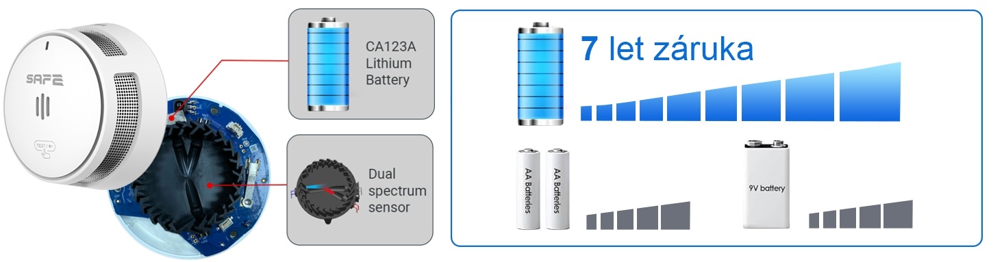 Nová generace detektoru požáru k nepřetržitému monitorování ovzduší na přítomnost kouře s přelomovou detekcí dvouspektrální prachu odolné optické komory napájeného integrovanou lithiovou baterií (zabudovanou, neměnitelnou) garantující mimořádně dlouhý provoz zařízení po více jak 10 let a prodlouženou 7letou zárukou.