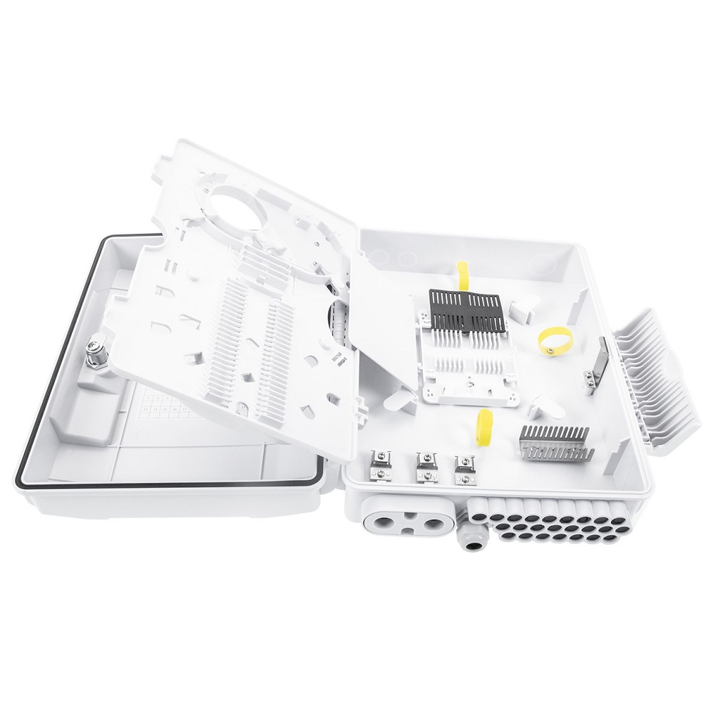 Venkovní FTTH spojovací box pro montáž na stěnu s ochranou IP65, vhodný pro ukončení/spojování optického kabelu v koncovém vchodu při výstavbě FTTH sítí. Uvnitř boxu se nachází (1) plastová kazeta a sloty pro až (24) SC simplex spojek. Součástí balení jsoVíce