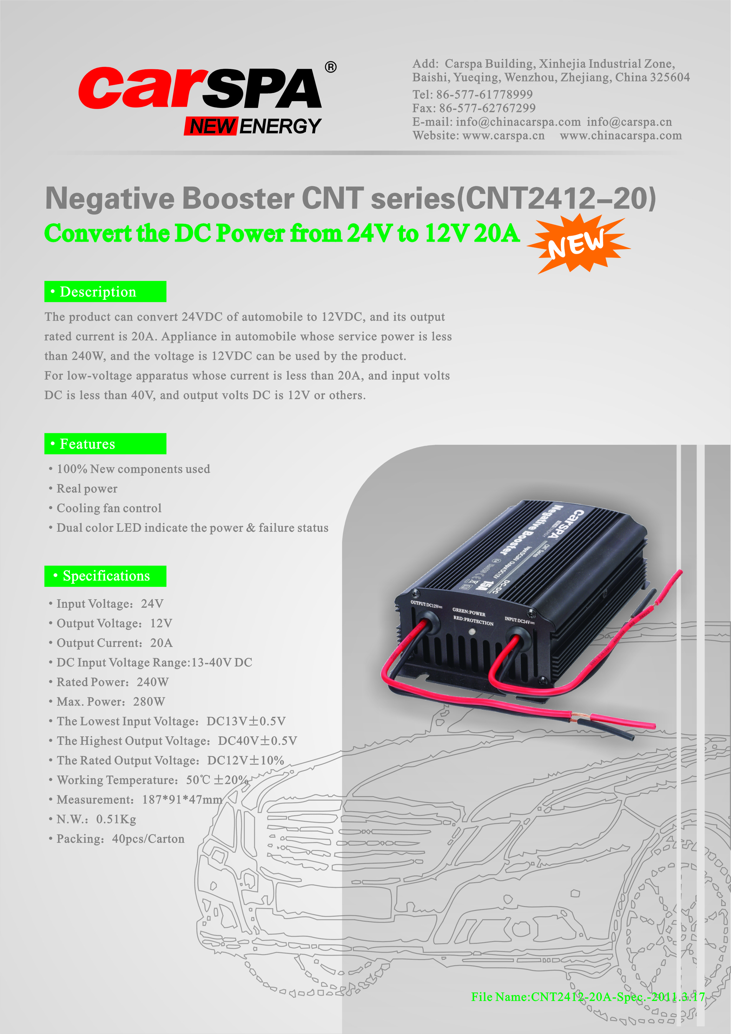 Tento výrobek může konvertovat 24V DC z automobilu na 12V DC a jeho jvýstupní proud je 20A. Použití pro spotřebič v automobilu, jehož výkon je nižší než 240W a napětí 12V DC.
