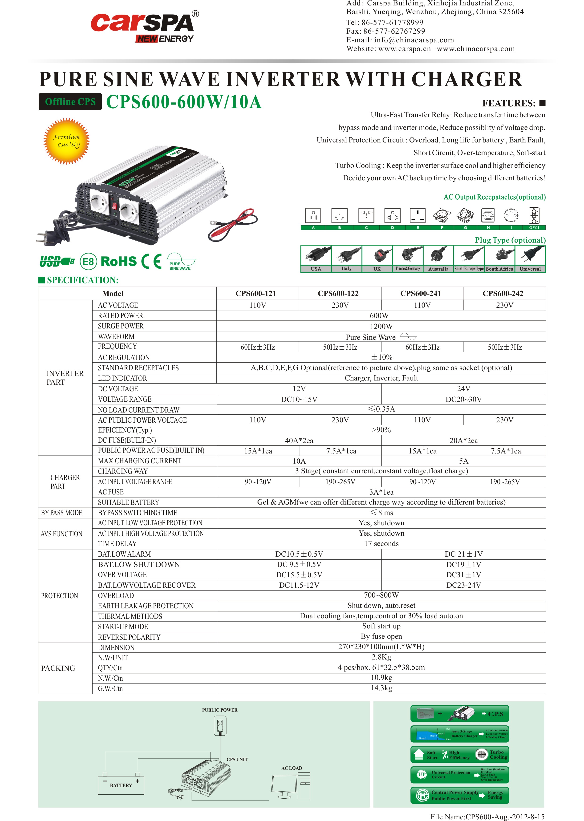 CARSPA - CPS měnič řady s nabíječkou funguje jako nabíječka, měnič, AVR a off-line UPS současně. Je to 100% čistý sinusový výstup a AVS funkce (přepětí, podpětí, prodleva) chrání jednotku, i když je napětí veřejné sítě nižší nebo vysoké a ideálně ochrání zařízení, pokud je veřejná síť velmi nestabilní, s častými poruchami.