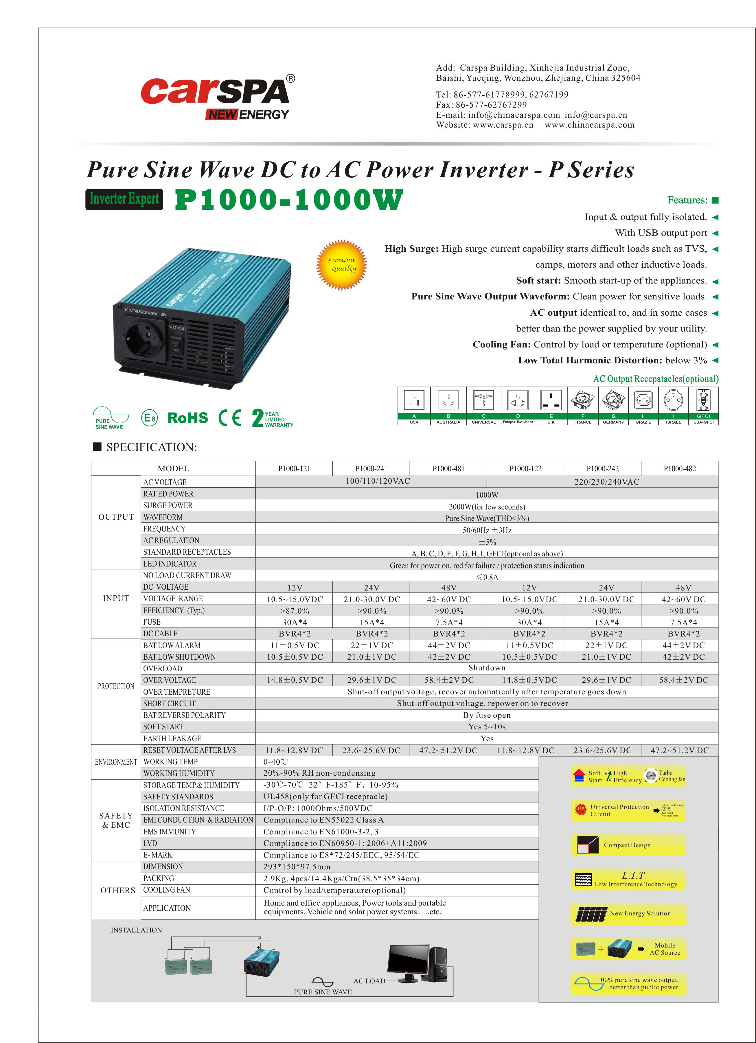 CARSPA P1000 - čisté sinusové měniče nabízejí vynikající kvalitu a skutečný sinusový výstup pro provoz Vašeho oblíbeného elektrické nářadí a jiných citlivých zatížení.