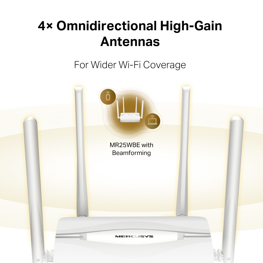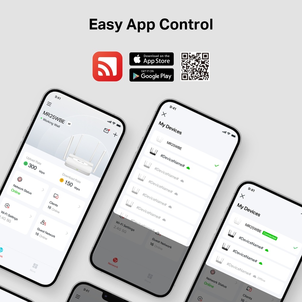- Wi-Fi 7: 160 MHz šířka pásma, 4K-QAM, MLO a další funkce, které MR25BE nabízí budou mít ohromující výkon pro vaši síť.