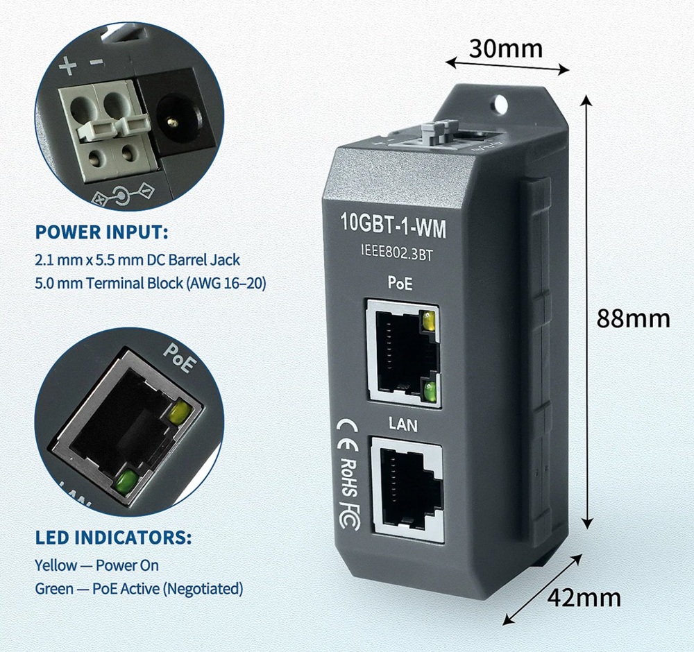 Maxlink 10GBT-1-WM je jednoduchý aktivní PoE injektor s podporou standardů 802.3af/at/bt a také 10G ethernetu (10/100M/1/2.5/10G). Je vybaven dvojicí stíněných ethernetových konektorů (1x vstup, 1x výstup) a napájení probíhá po 4 párech (napájení po 2 párVíce