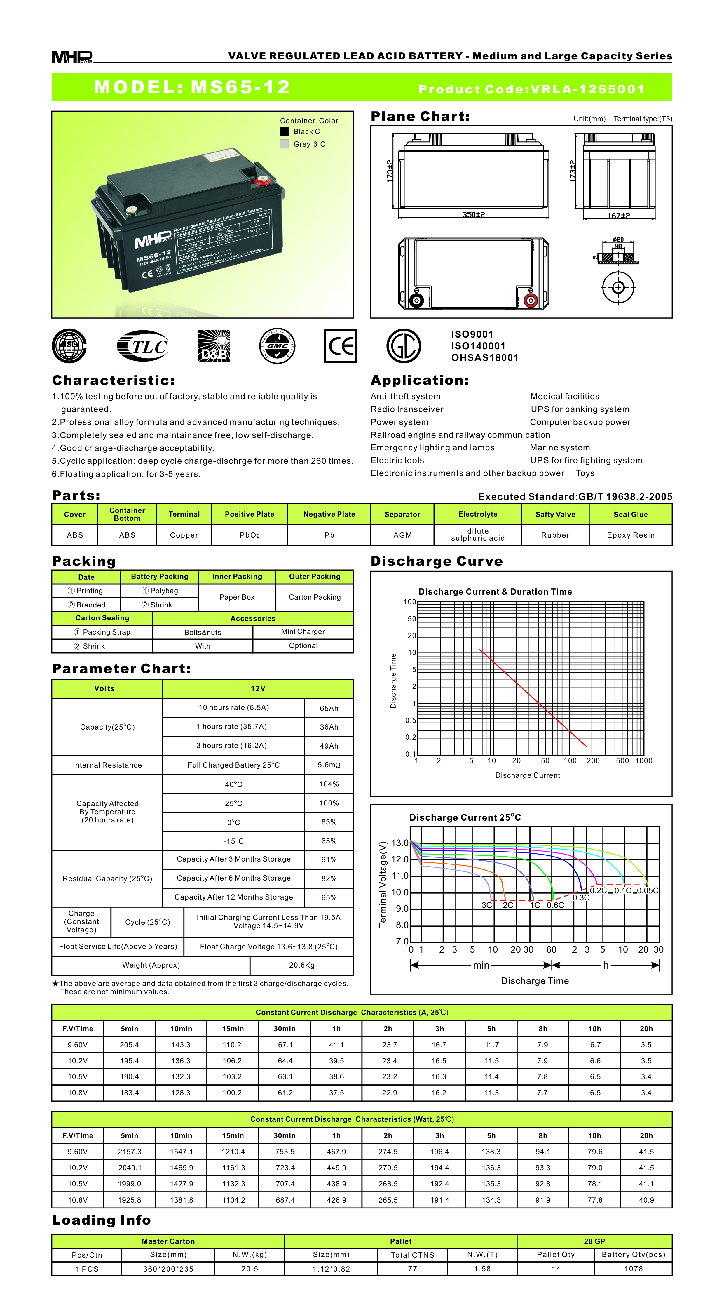 MHPower MS65-12 olověný akumulátor AGM 12V/65Ah, Terminál T3 - M6
