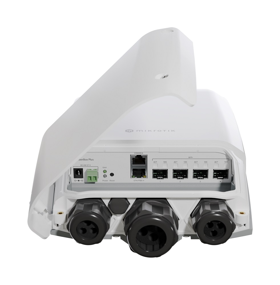 Venkovní 4-portový SFP+ switch bez ventilátoru a žebrováním na zadní straně s možností routingu nabízí Gigabitový ethernet pro management či PoE IN napájení, 4 optické SFP+ porty s rychlostí 1/10 Gbps, konzolový RJ45 port, DC konektor a svorkovnici s napáVíce