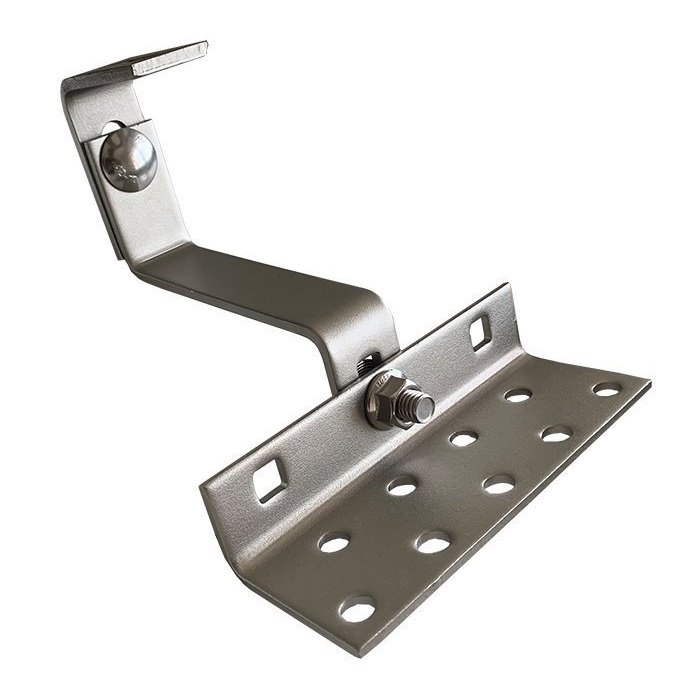 Střešní hák nastavitelný, ocelový pro uchycení solárních panelů. Masivní střešní hák pro lišty odolá těžkému sněhu i větru a slouží pro připevnění solárních panelů na šikmé střechy s taškovou krytinou. Připevňuje se vruty na střešní trámy. - Délka vyloVíce