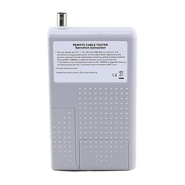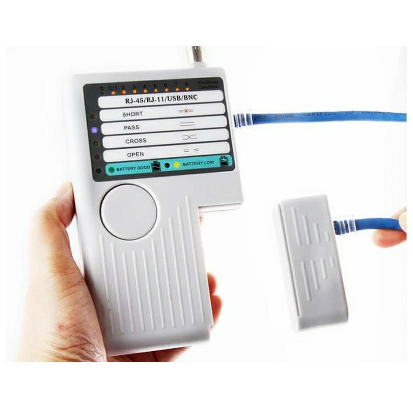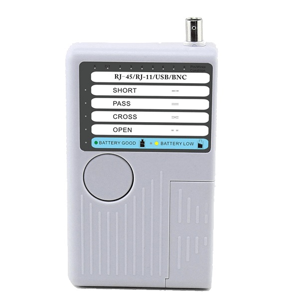 Tester pro síťové kabely zakončené konektory RJ-11,12,45 nebo koaxiální kabely a USB. Dokáže zjistit, zda kabel není přerušený, jestli nemá zkratované některé žíly nebo zjistit typ kabelu - patch nebo cross. Lze testovat kabely jak volné přímo testerem, tVíce