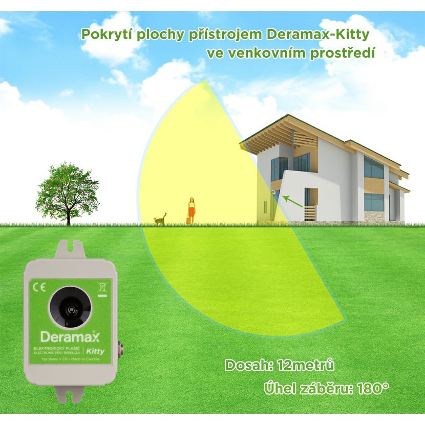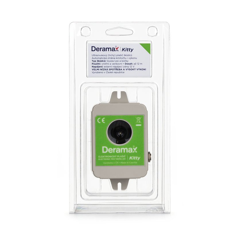 Ultrazvukový plašič (odpuzovač) Deramax-Kitty je elektronické zařízení, které slouží k ochraně venkovních prostor před toulavými kočkami, psy a divokou zvěří. Škůdci jsou trvale obtěžováni ultrazvukovými signály plašiče a v krátkém čase opouští chráněný prostor. Deramax-Kitty pracuje v kmitočtové oblasti, která je pro člověka za hranicí slyšitelnosti, proto neruší a neobtěžuje své okolí nepříjemným hlukem. Provoz přístroje je zcela ekologický, bez využití chemických prostředků.