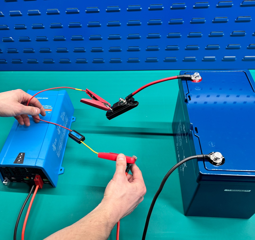 3.2. Připojte druhou krokosvorku ke kladné vstupní svorce střídače, měniče/nabíječky nebo MPPT. V případě potřeby použijte krátký prodlužovací vodič, abyste dosáhli na svorku.