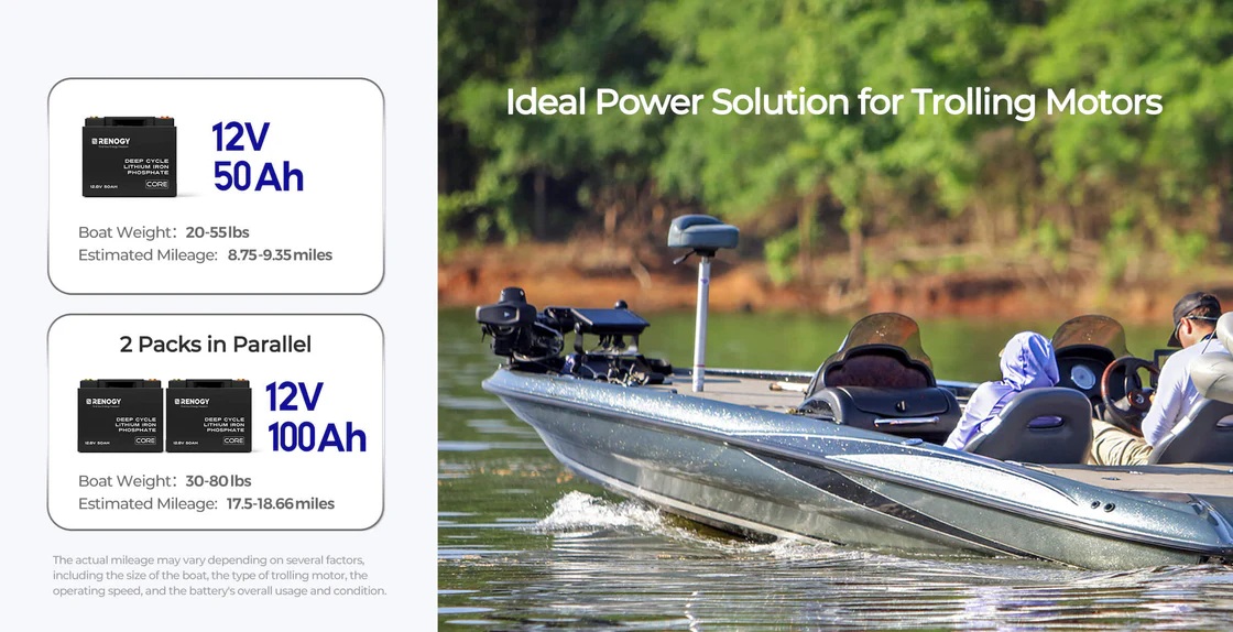 Dojížděcí vzdálenost dosažitelná s 12V 50Ah baterií pro trollingový motor tažící loď se určuje vynásobením rychlosti jízdy trollingového motoru délkou používání. Typicky trollingové motory pracují při rychlostech od 2 do 5 mil za hodinu (přibližně 3,2 až 8 kilometrů za hodinu).