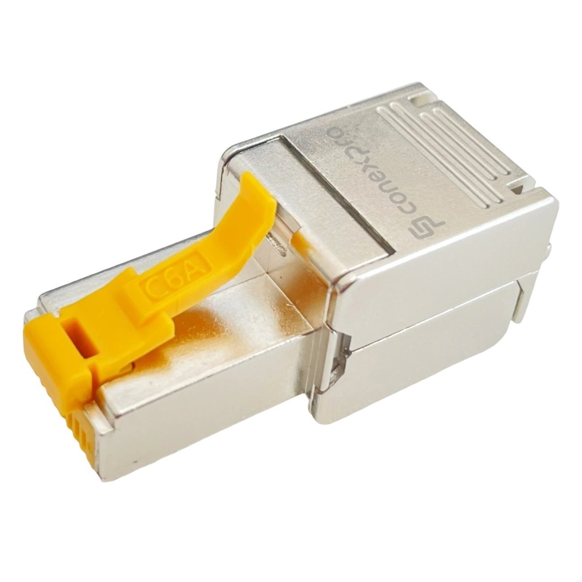 Skládaný stíněný konektor RJ45 s instalační vložkou včetně kovového uchycení přívodního kabelu od značky Conexpro je navržen pro použití s STP/FTP kabelem třídy CAT6A s vodiči typu drát. Tyto konektory jsou nedílnou součástí strukturované kabeláže a jsou